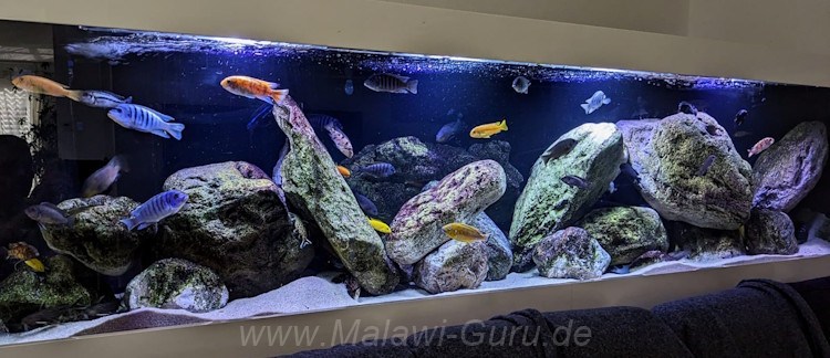 Hier nun dieses Malawisee-Aquarium mit 1050 Litern. Es gibt unzählige Buntbarsch-Arten sowie Ideen, wie man ein Malawisee-Aquarium, auf die ganz eigene Art einrichten kann. Immer wichtig und im Vordergrund sollten die Bedürfnisse der Malawisee-Buntbarsche stehen.