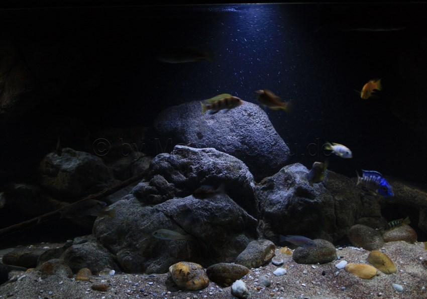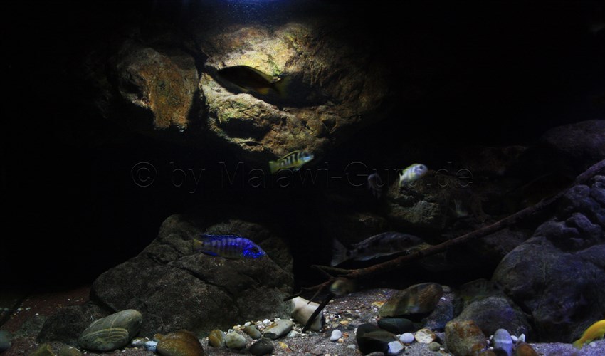 Im Becken ist ein Mix aus Nonmbuna Arten und dazu wurden Mbuna gewählt, die zu den Insektenfressern gezählt werden, in diesem Fall Labidochromis caeruleus ‚yellow‘. Wir listen den Besatz hier nicht auf, weil das Thema die Gestaltung war.