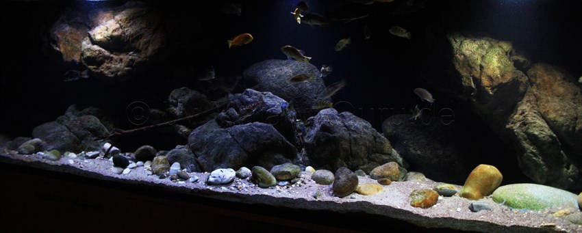 Dabei ist dieses Malawi-Becken komplett auf die Bedürfnisse der darin lebenden Buntbarsche ausgelegt worden. Das gesamte Malawi-Becken ist mit Modulen von Rockzolid und Trixie dekoriert. Und dabei kamen auch echte Kieselsteine zum Einsatz, diese sind in verschiedenen Körnungsgrößen auf dem Bodengrund verteilt, aber auch im Bodengrund. Diese eine Sedimentschicht suggerieren.