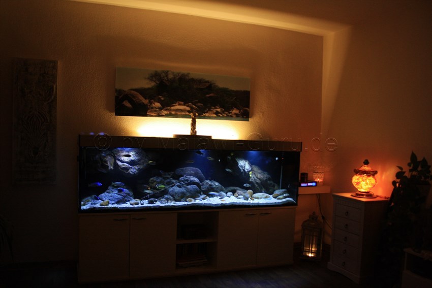 Die Beleuchtung bei diesen 660 Liter Aquarium aus der Übergangszone, besteht aus 3 Day Time Clustern und wird über einen den GHL Profilux 3 gesteuert. Welches sehr schön viele Szenarien anbietet, um das Malawisee Aquarium ins rechte Licht zu setzen.