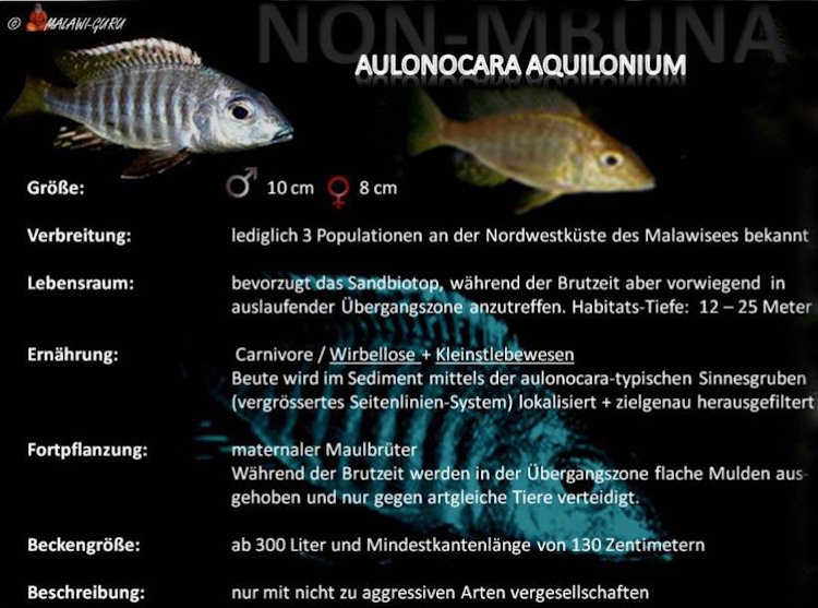 Aulonocara aquilonium gehört zu den Aulonocara der Sandzone und lebt dort in enormen Schulen direkt über den riesigen Sandflächen. Oftmals sind diese ‚jagenden‘ Schwärme in unmittelbarer Nähe von großen, einzeln vorkommenden Felsbrocken anzutreffen.
