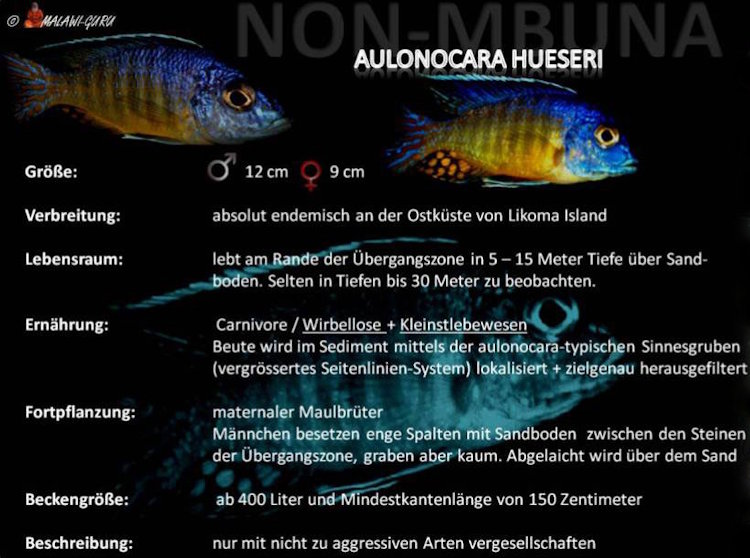 Aulonocara hueseri ist ein ruhiger und eher durchsetzungsschwacher Cichlide, welcher nicht mit zu aggressiven Arten vergesellschaftet werden sollte.