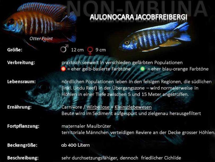 Anzunehmen ist daher, dass es sich bei den Jacobfreibergi eher um eine Ur Art der Gattung Aulonocara handelt, aus welcher sich im Laufe der Evolution die anderen, besser ausgestatteten Arten abgeleitet haben.