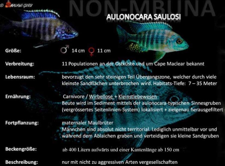 Durch das nicht-territoriale Verhalten, und die daraus resultierende Friedfertigkeit des Aulonocara saulosi ist es auch möglich, kleinste Gruppen (z. B. 2 M/4 W) zu pflegen.