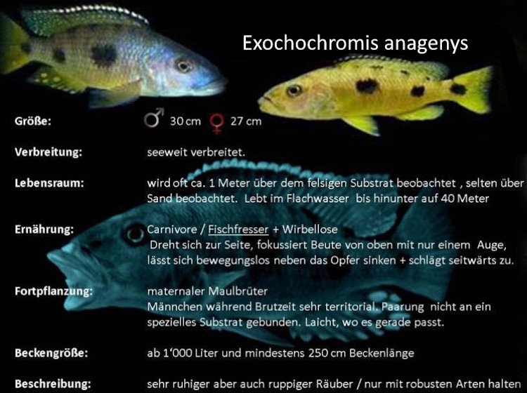 Da Exochochromis anagenys in fast allen Tiefen vorkommt, ist die Definition der Aquarienbeleuchtung anhand dieser Art eher zweitrangig. Ich empfehle deshalb, sich beleuchtungstechnisch anhand der anderen vergesellschafteten Arten zu orientieren.