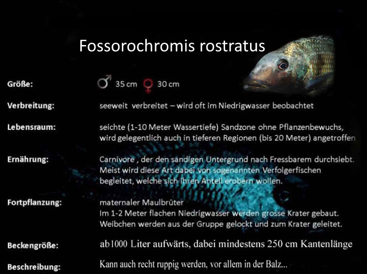 Für die Haltung im Malawisee-Aquarium mit Fossorochromis rostratus, bietet sich die Gestaltung einer großen Sandfläche an, welche durch einzelne größere Felsbrocken unterbrochen wird. Der Bepflanzung eines Rostratus-Beckens ist nichts entgegenzusetzen, sie ist aber keinesfalls Voraussetzung.