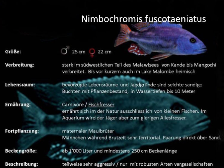 Nimbochromis fuscotaeniatus fällt während der Brutzeit durch seine außerordentliche Aggressivität gegenüber anderen Arten wie auch innerartlich auf. Auch dieser Räuber gehört wie alle Malawisee-Buntbarsche zu den ‚Maulbrütern‚ im See.