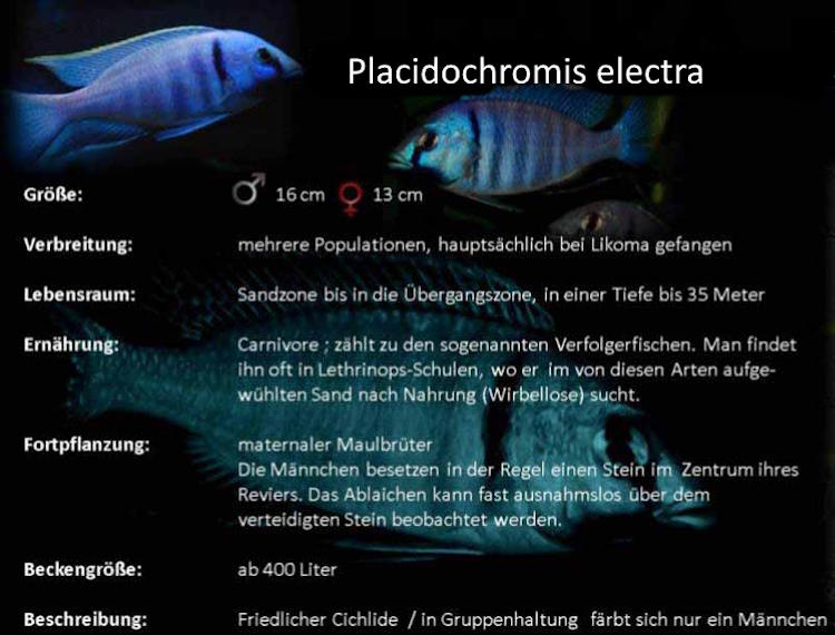 Auch einer Pflege von Placidochromis electra mit einigen Mbuna-Arten steht nichts im Wege, hier aber darauf achten, dass die gewählten Mbuna eher Insektenfresser oder zu den ‚Carnivoren‘- Buntbarschen gehören. Da wären z. B. Labidochromis-Arten (nicht alle) eine Option.