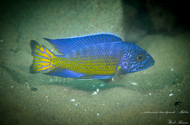 Aulonocara stuartgranti ‚Mdoka Reef‘ gehört zu den Carnivoren Cichliden. Über die Aulonocara-typischen Sinnesgruben (vorwiegend auf der Kopfunterseite) ortet dieser Wirbellose und Krebstierchen im Sediment, welche dann durch einen zielgenauen Stoß in den Sand erbeutet werden.