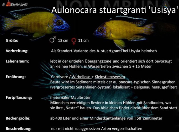 Aulonocara stuartgranti ‚Usisya‘ gehört zu den Carnivoren Cichliden. Über die Aulonocara-typischen Sinnesgruben (vorwiegend auf der Kopfunterseite) ortet dieser, Wirbellose und Krebstierchen im Sediment, welche dann durch einen zielgenauen Stoß in den Sand erbeutet werden.