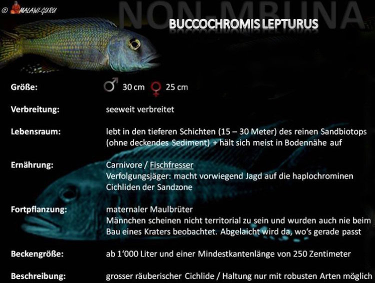 Was aber in der Natur lediglich im sehr seichten Biotop der großen Jungfischschwärme zutreffen würde. Buccochromis lepturus kann in Becken ab mindestens 1000 Litern gehalten werden, sofern eine Mindestkantenlänge von 250 cm sichergestellt wird, je mehr, desto besser.