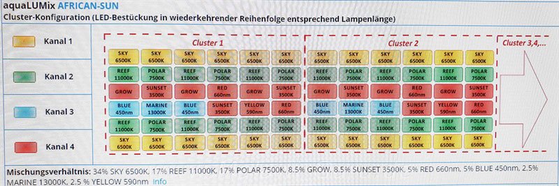 Ich wollte die Lichtfarben der Leuchten, als auch die Leuchten selbst, einzeln und unabhängig voneinander dimmen können. Die aquaLUMix-LED Leuchten ermöglichen einen gleitenden Sonnenaufgangs-Modus, oder auch Wolkenflüge und anderes mehr z.b.