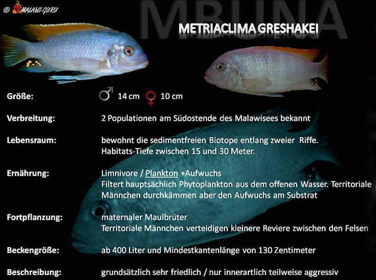 Der Fang und Export von Tieren, welche als gefährdet eingestuft worden sind, ist nicht erlaubt. Aus diesem Grund handelt es sich bei allen im Fachhandel oder über Züchter erhältlichen Metriaclima greshakei um WFNZ oder DNZ, WF Tiere sind absolute Seltenheit!