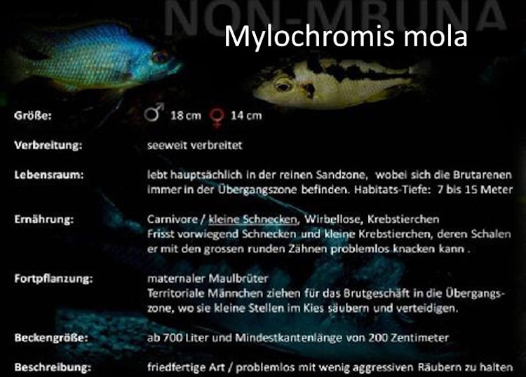 Mit dem Buntbarschverzeichnis, haben wir eine Sammlung zusammengestellt, die Mbuna- und Nonmbuna-Arten aus dem Malawisee beschreibt. Hier bekommt man eine Menge Informationen, zu diesen endemisch lebenden Buntbarschen aus dem Malawisee.