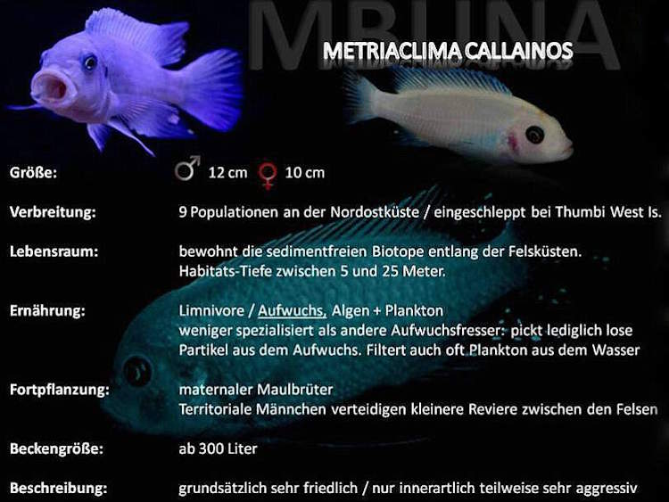 Metriaclima callainos kommt in 9 verschiedenen Populationen an der Nordost- und an der Nordwest-Küste vor. Um das Handling für die Fangstationen zu vereinfachen, wurde bei Thumbi West Island eine künstliche Population angesetzt, welche sich im Laufe der Jahre sehr gut etabliert hat.