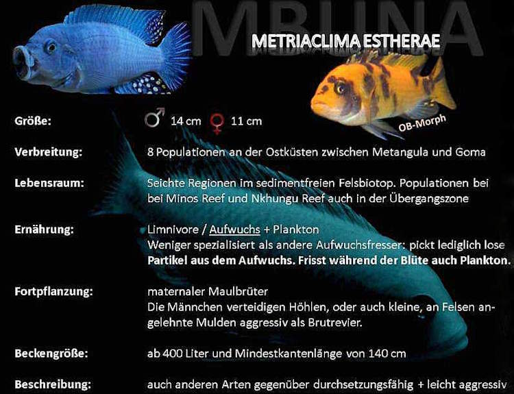 Während der Planktonblüte löst sich Metriaclima estherae vom Substrat und bildet im freien Wasser riesige Schulen, um gemeinsam vom im Überfluss vorhandenen Plankton zu fressen. Auch diese Mbuna Art gehört wie alle Malawisee Buntbarsche zu den ‚Maulbrütern‚.