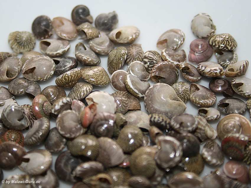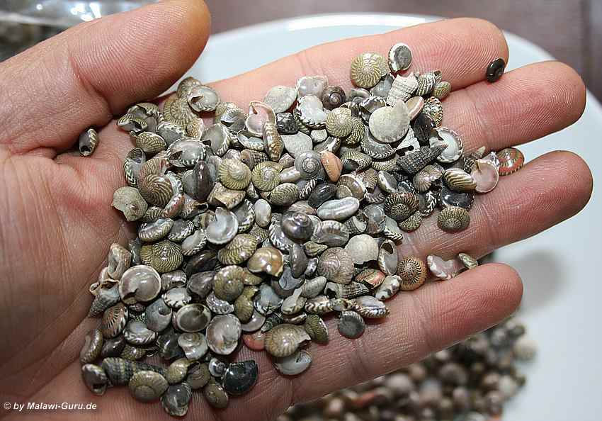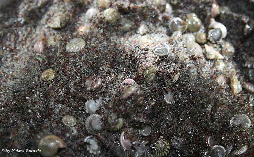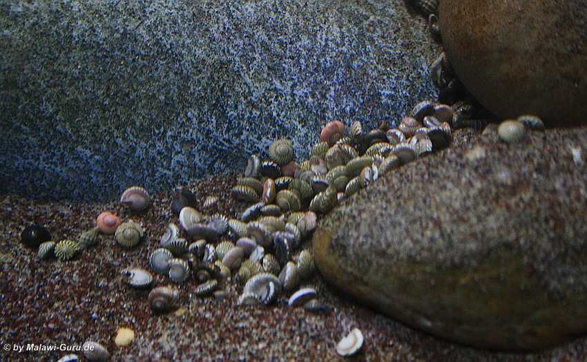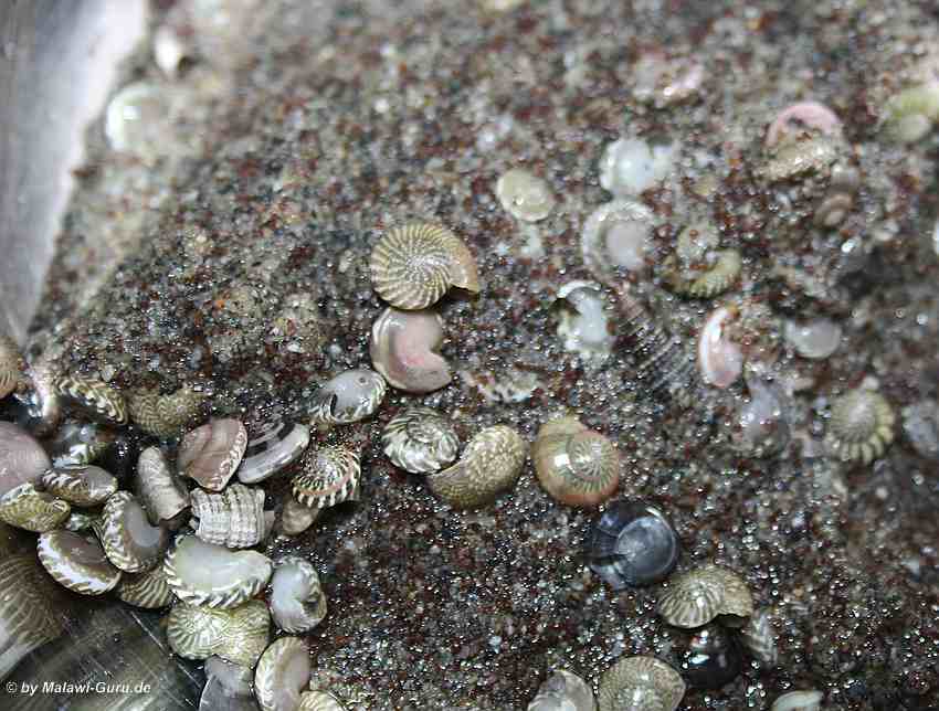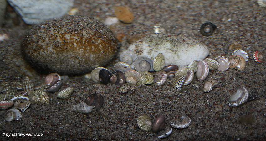 Minimuscheln und Minischnecken Häuser in ein Malawisee Aquarium dekoriert, genauer gesagt in den Bodengrund zum Malawisee Aquarium, wertet das gesamte Becken immens auf. Dazu ein Tipp zur naturnahen Gestaltung eines Bodengrundes.