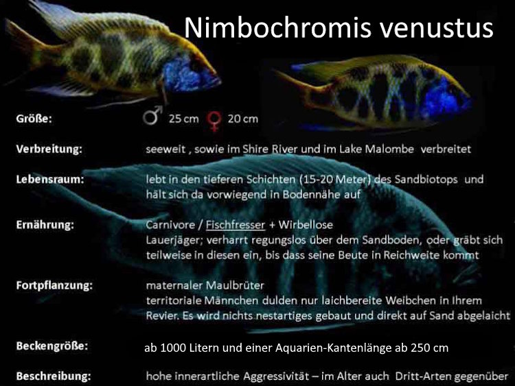 Nimbochromis venustus fällt also durch seine außerordentliche innerartliche Aggressivität auf. Je älter Nimbochromis venustus wird, desto aggressiver verhält er sich, auch anderen Arten gegenüber. Auch dieser Nonmbuna gehört zu den ‚Maulbrütern‚, wie alle Malawisee-Buntbarsche.