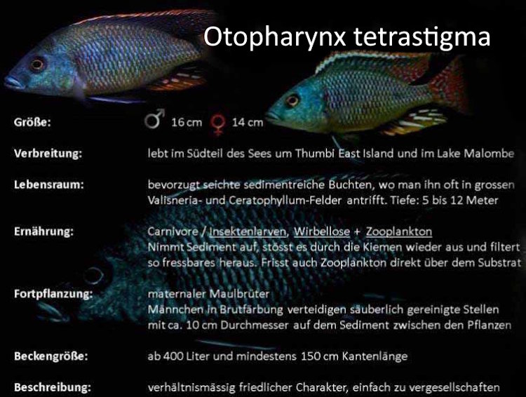 Natürlich kann der Otopharynx tetrastigma auch in Harems (1 M/3 W) gepflegt werden. Immer dran denken: Das Ganze ist abhängig von der Endgröße des Malawisee-Aquariums. Im Verbund mit anderen Buntbarschen im Aquarium sollten aber Becken ab 600 Litern gestellt werden. Die von uns empfohlenen 400 Liter beziehen sich auf reine ‚Artenbecken‚.