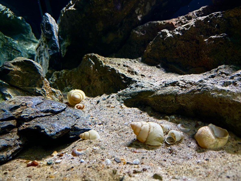 Der Bodengrund ist ein Gemisch aus dem Back to Nature Malawi-Sand, Dupla Ground und einem feineren beigen Sand ähnlich wie dem von der Firma Schicker-Mineral. Dazu kamen noch kleine Muscheln und Neothauma mit eingemischt