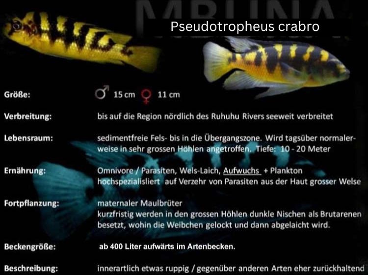 Der ‚Crabro‘ kann problemlos mit fast allen ‚limnivoren‘ und ‚omnivoren‘ Mbuna vergesellschaftet werden. Obwohl sie Fischläuse frisst, ist deren Verdauungs-Trakt für die Verwertung von Aufwuchs und Algen ausgelegt.