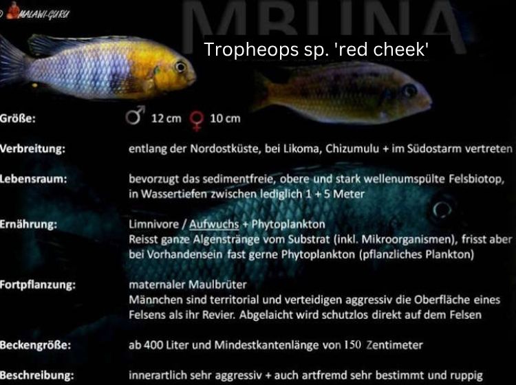 Wissenschaftliche Untersuchungen haben aber zum Ergebnis geführt, dass die Tropheops aufgrund der stark abgerundeten Schnauze und ihres kleinen, tief sitzenden Mauls, dessen Unterkiefer kürzer als der Oberkiefer ist.